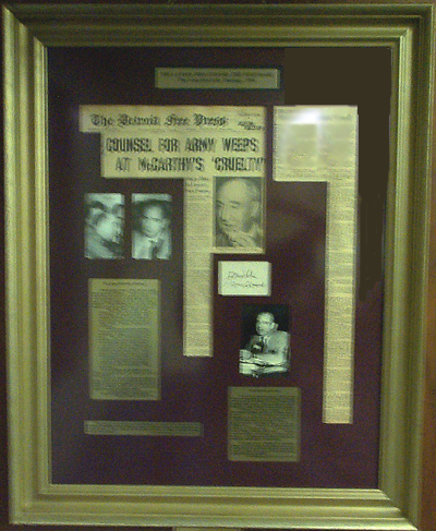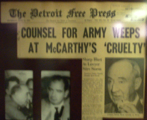 Welch had been questioning Roy Cohn, counsel to the McCarthy sub-committee in its investigation of alleged communists in the Army. The Army countercharged that McCarthy and Cohn sought special treatment for sub-committee aide G. David Schine, a recent draftee into the Army. McCarthy had interrupted to advise the audience on this nationally televised hearing that a young lawyer in Welch’s office had been a member {in law school) of the National Lawyer’s Guild which McCarthy labeled as a Communist front organization. Now, McCarthy again began to go over the young lawyers record. Welch then finished: