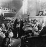 Zenger petitioned the court * to appoint a lawyer for him. The Chief Justice obliged by naming John Chambers, a competent lawyer but a Governor’s man. * In a brilliant stroke, Alexander engaged Andrew Hamilton of Philadelphia to defend Zenger. Zenger’s trial * took place on August 4, 1736. After the Attorney General read his information, Chambers delivered his opening speech, and the stage seemed set for a weak defense of the printer. * Andrew Hamilton rose dramatically from his chair in the City Hall courtroom, and announced * that he would participate in Zenger’s defense. Armed with years of courtroom experience and a well-prepared brief, speaking with the daring of one indifferent to the local political contests, Hamilton made short work of convincing the * jury of Zenger’s innocence. When the arguments were concluded at the end of the day, it took the jury only a few minutes to return a verdict of not guilty. “Huzza” rang out for Zenger and Hamilton.